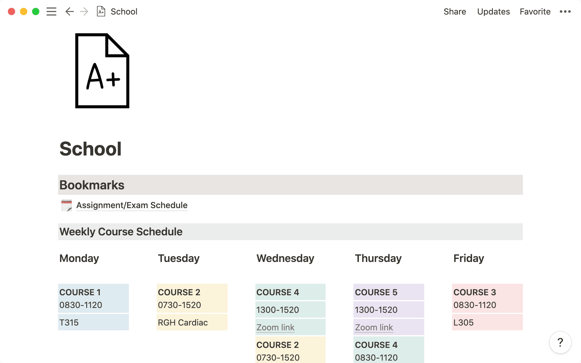 Instead of running through hallways searching for the right classroom, a lot of you might be searching for the right Zoom link. Though this template has a whole other section for work and life, we love the way it lays out your weekly class schedule and makes Zoom links easy to access.