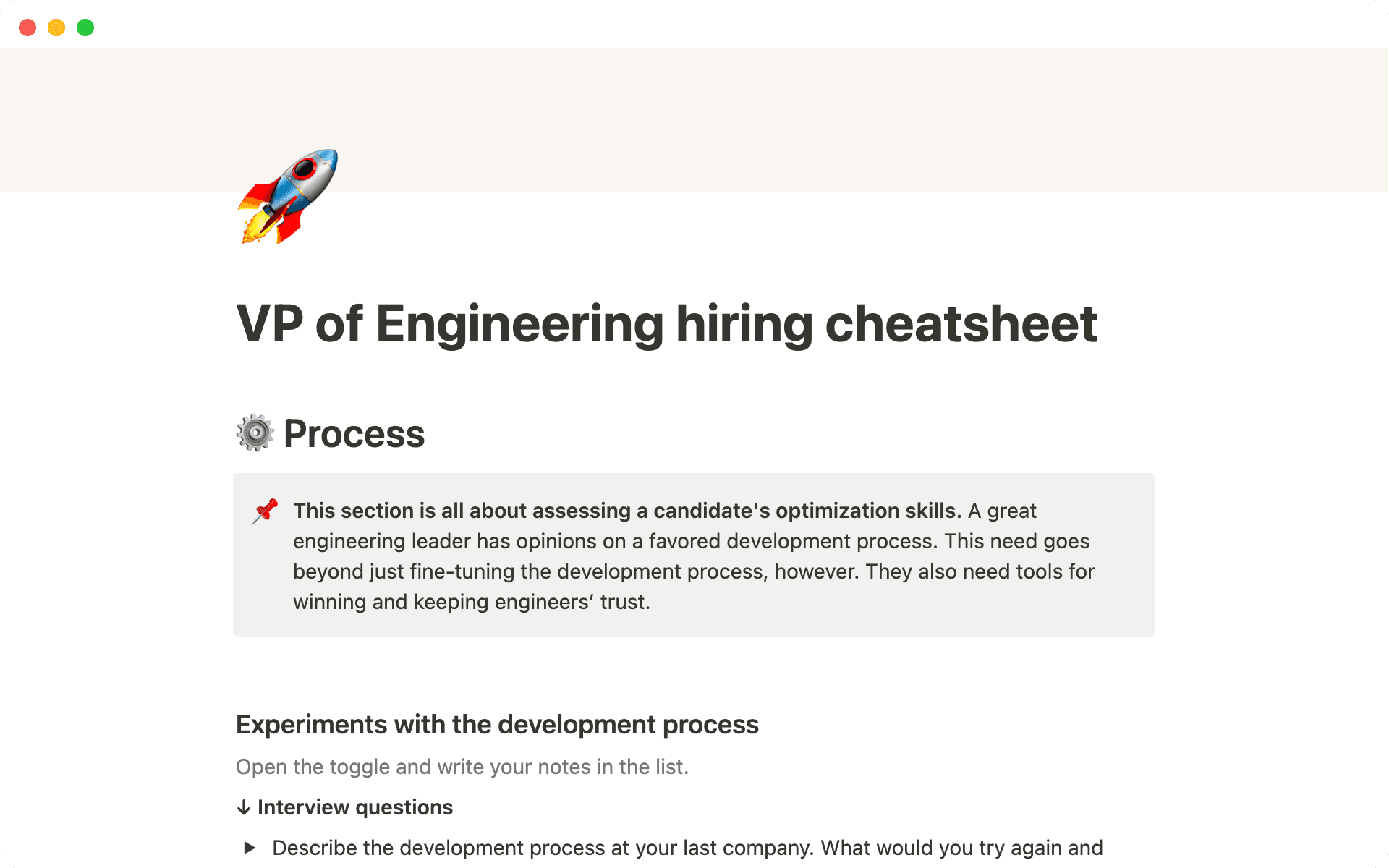 Use his Notion template as a cheatsheet both before and during an interview. It includes all the questions you need to ask and allows you to measure the candidate's responses — so you can make sure you're hiring the right VPE for your company's needs.