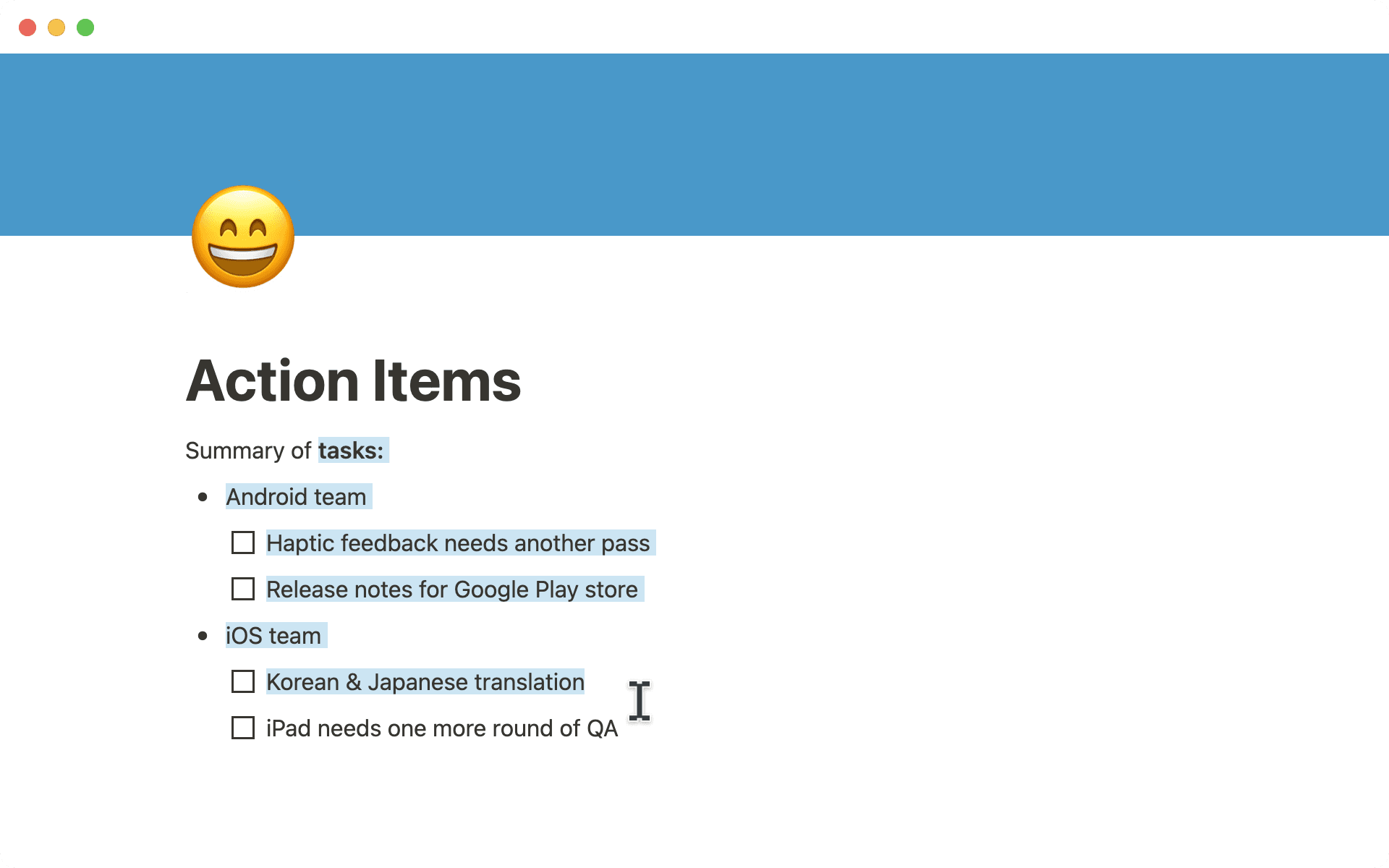 • On mobile: Now you can select or copy/paste multiple items at once! Double tap to select text, and drag your selection to include content across multiple blocks.